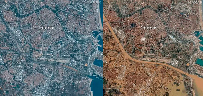 | Café de las Ciudades #240 Año 23 – número 240 – Diciembre de 2024 – ISSN 2346-9080 – REVISTA DIGITAL Portada: imágenes satelitales de Valencia antes y después de la inundación del pasado 29 de octubre (fuente: MAXAR). Obsérvese la escasa o nula afectación del siniestro sobre el antiguo cauce del río Turia, en la parte superior de la imagen. En este número, un grupo de entidades y profesionales se manifiestan sobre el hecho y reclaman incorporar la cultura territorial a la vida social y política de las comunidades. Este número de café de las ciudades aborda buena parte de los muchos aspectos que componen lo diverso de la ciudad, ese "hecho humano por excelencia" en palabras de Lévi-Strauss. Así, Fernanda Levenzon desarrolla el concepto de un urbanismo que va de la mano del derecho urbano; un amplio grupo de prestigiosas entidades profesionales se manifiestan sobre las recientes inundaciones en Valencia y otras partes del territorio español; Federico Duelli nos introduce a los contextos burocráticos del arte urbano y quien esto escribe visita asombrado la casa Las Nubes de Enrique Amorim en Salto.