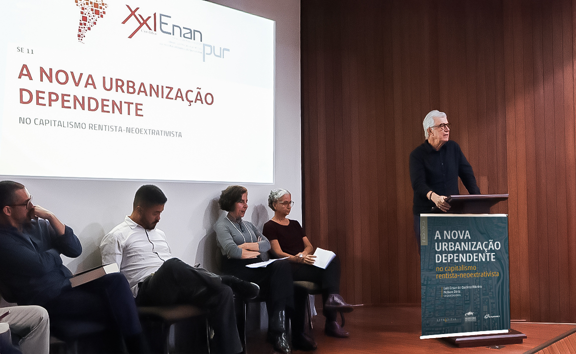 | Como o modo rentista-neoextrativista se manifesta na periferia do capitalismo global? Para identificar e analisar os nexos atuais entre dependência e urbanização, a coletânea "A nova urbanização dependente no capitalismo rentista-neoextrativista" foi lançada no XXI Encontro Nacional da Associação Nacional de Pós-Graduação e Pesquisa em Planejamento Urbano e Regional (ENANPUR). Como forma de apresentação mais ampla da obra, foi realizada uma Sessão Especial com a presença de alguns dos autores da obra, organizada pelo coordenador nacional do INCT Observatório das Metrópoles, Luiz Cesar de Queiroz Ribeiro, e pelo pesquisador do Núcleo Rio de Janeiro, Nelson Diniz. Esta edição especial do boletim, reúne as exposições realizadas durante a sessão. | |